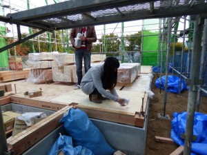 まずは、N様ご夫婦で建物の四方と中央に、塩とお酒でお清めです。
