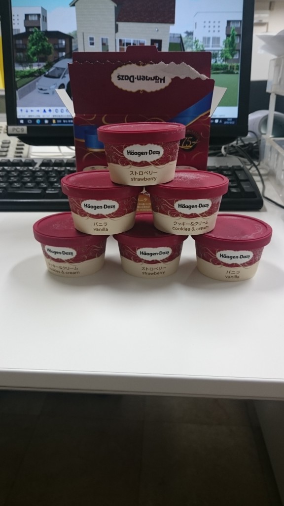 日々のあれこれ アイス こんばんは、倉敷ハウジングのなかつかです 今日、最近寒くなってきたにも関わらずなぜか大橋さんからアイスの差し入れ・・・ ですがハーゲンダッツだったので即座に完売! すぐさま取りに来た栢野さんもおいしそうにいただいています 僕も無事クッキー&クリームをゲットしておいしくいただきました 次はおいしいおでんなんかが良いですねぇ