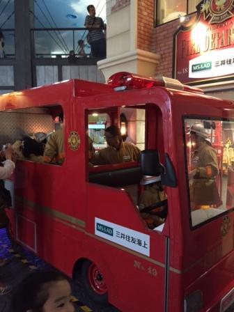 着替えたら、園内を走る消防車に乗って現場へ出動!