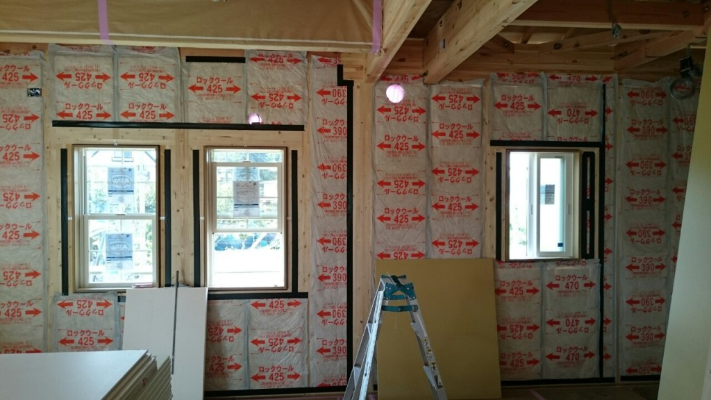 断熱材を本当に隙間なくびっしりと貼り付けています 次は壁下地のボード貼りです