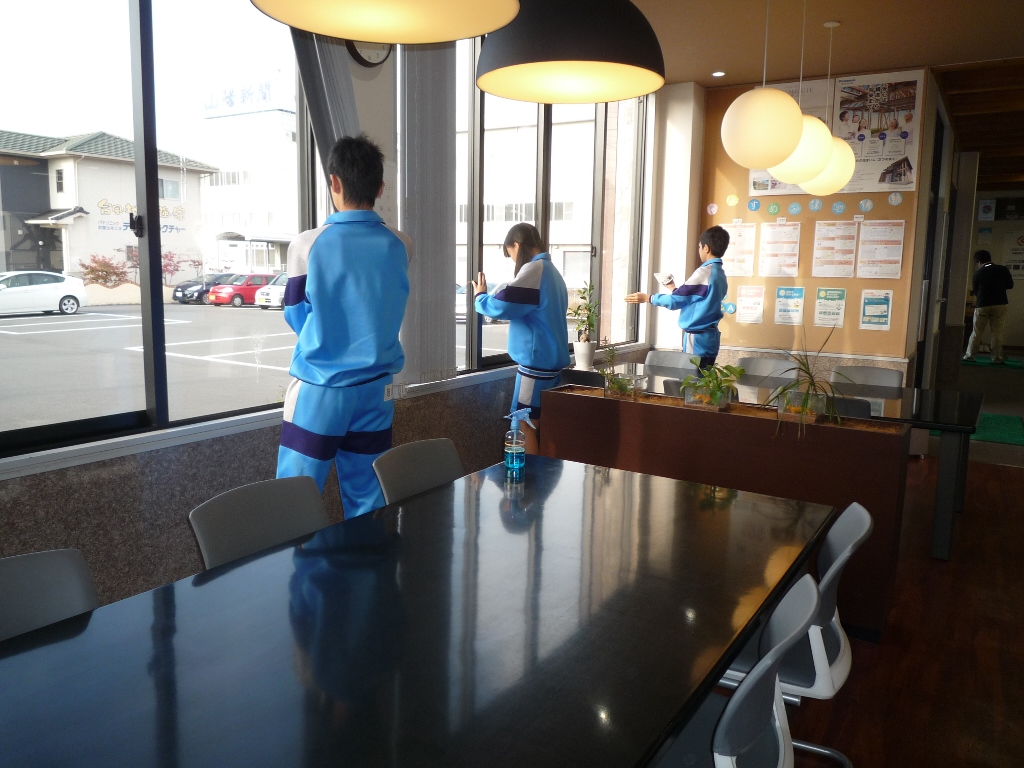 始業前、事務所の掃除です。みんなで窓をきれいにしました。