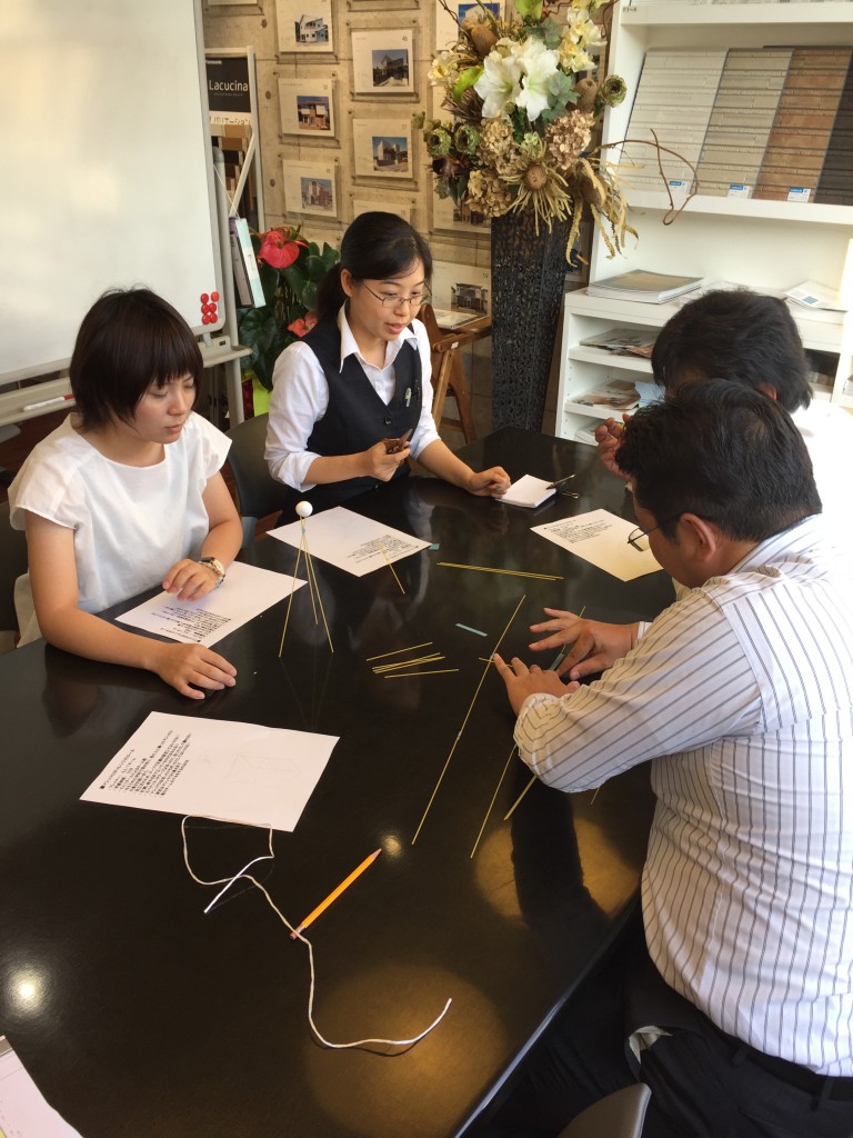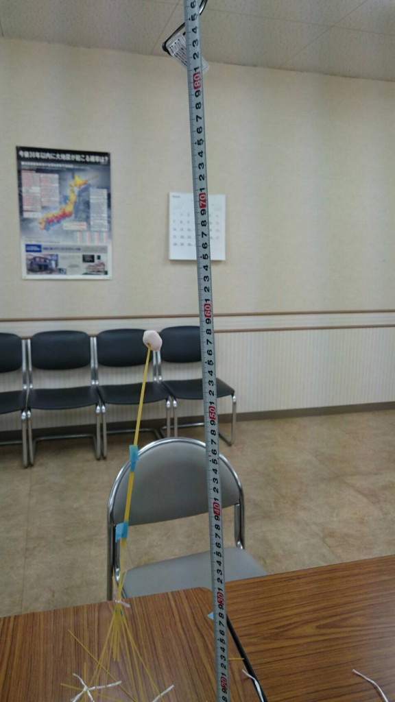 塔のテッペンにマシュマロを乗せどちらが高いか競います。