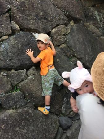 待っている間に、暇をもてあました長男は石垣を登って遊んでいました。