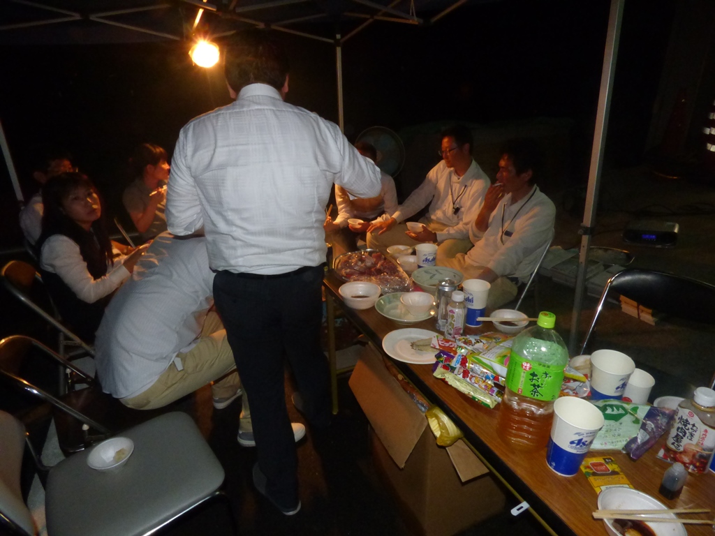 我が社のBBQ大臣である大橋君が、最高の焼き加減で肉をみんなに配ってくれてます。たよりになる男です!