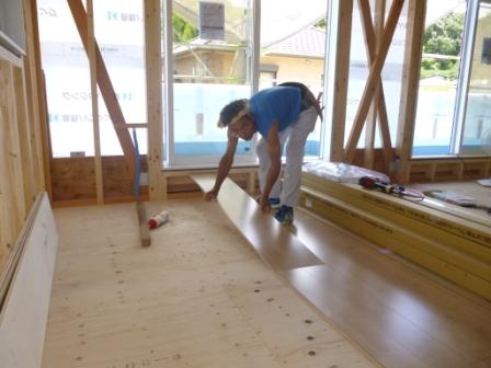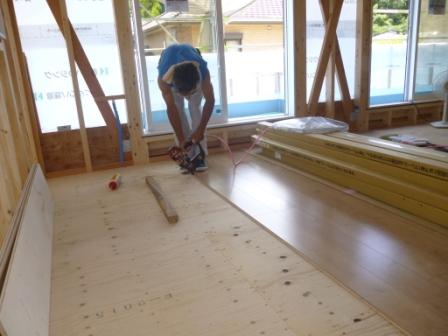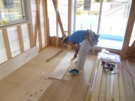 家の中では、棟梁さんが床のフローリングを貼っていました。