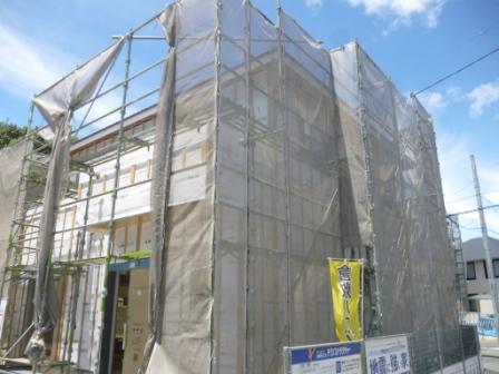 アルミサッシの取付が終わって、外壁サイディング施工前の透湿防水シート貼りが終わってる状況です。