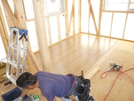 大工さんが床のフローリングを貼って終わって、電気の配線工事中でした。