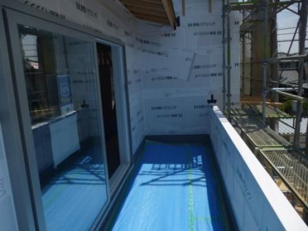 屋根工事は完了して、外壁は仮のブルーシートに代わりに透湿防水シートを貼っています。