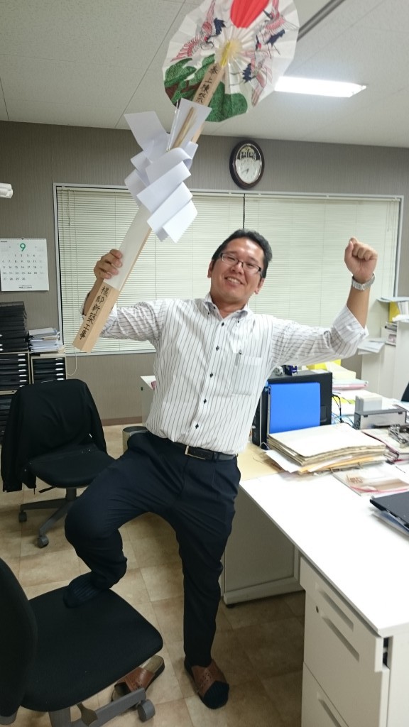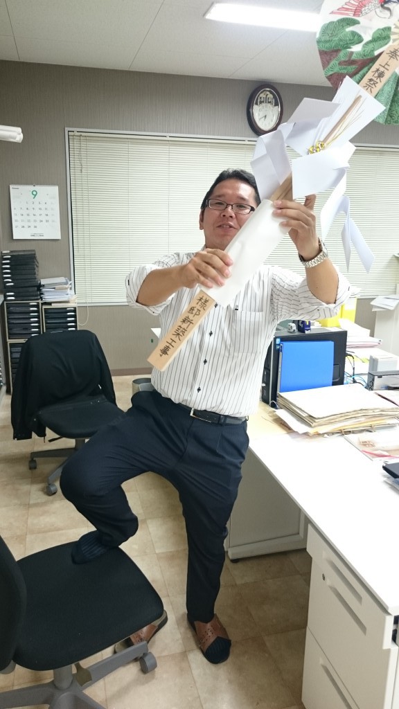 日々のあれこれ 明日は棟上げ! こんばんは倉敷ハウジング の中務です 最近朝の気温が低くて布団から出るのがしんどくなってきました さて、明日はお客様のおうちの棟上げがあります その棟上げの準備で、小屋裏に飾る「御幣」を顎でこき使われて作っている千田君と中務 ↓↓↓ 千田君と中務を顎でこき使った明日の棟上げの担当営業である大橋さん ↓↓↓ 担当物件の棟上げは今回が初めてということでとても張り切っています♪ 明日は降水確率が微妙なので無事棟が上がるのを祈っています