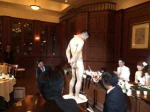 ブーメランパンツをはいたYさんが、おしりに割り箸をはさんでいます。