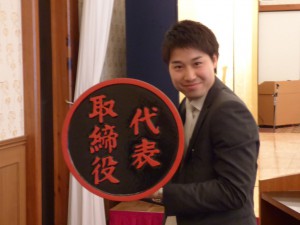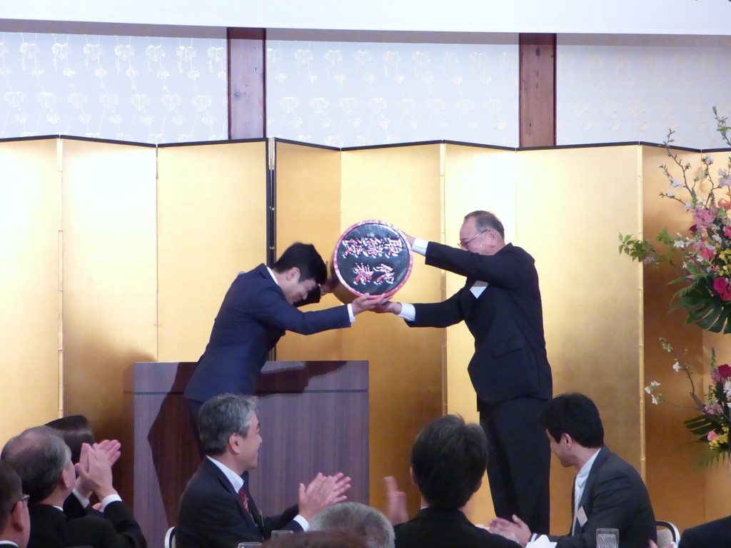 しっかり皆さんの笑いを取り会長から新社長へ代表印が授与されました