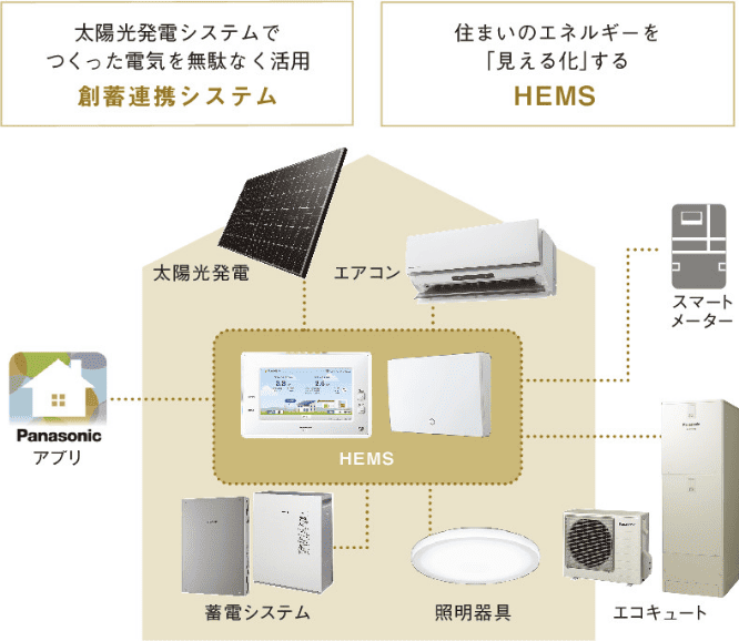 また、太陽光発電システムに蓄電池を組み合わせた「創蓄連携システム」を取り入れ、住まいのエネルギーの流れを「見える化」するHEMSを活用することで、さらなるエネルギーの効率的な使用が可能となります。