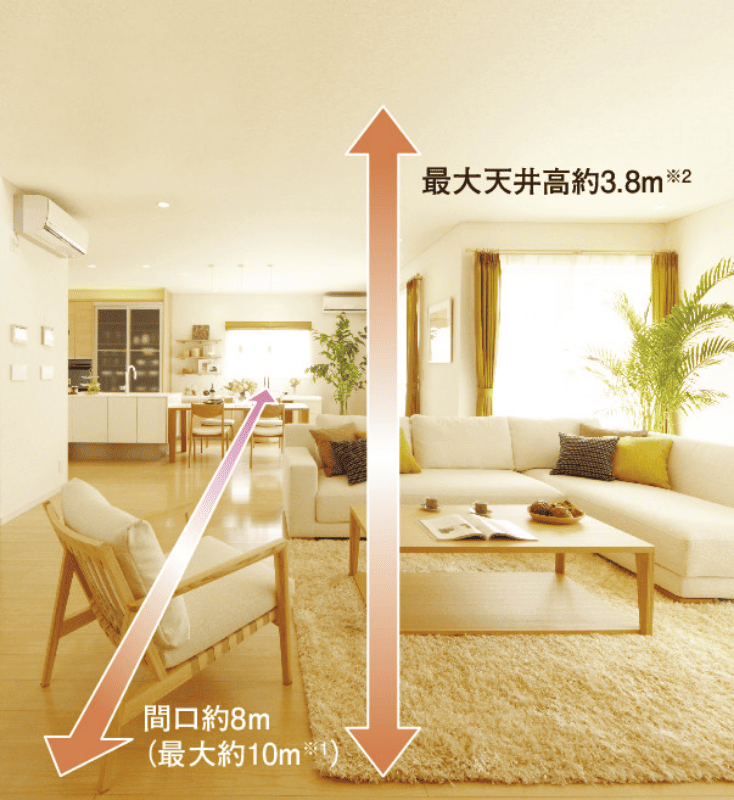 テクノビームを使用することで、タテヨコに広い空間を作ることができます。柱と柱の間を最大約10mまで広げられ、最大天井高も約3.8mと、オープンな空間を設けることができます。