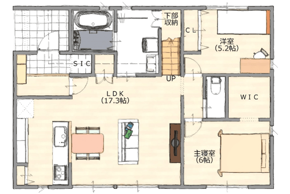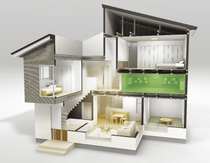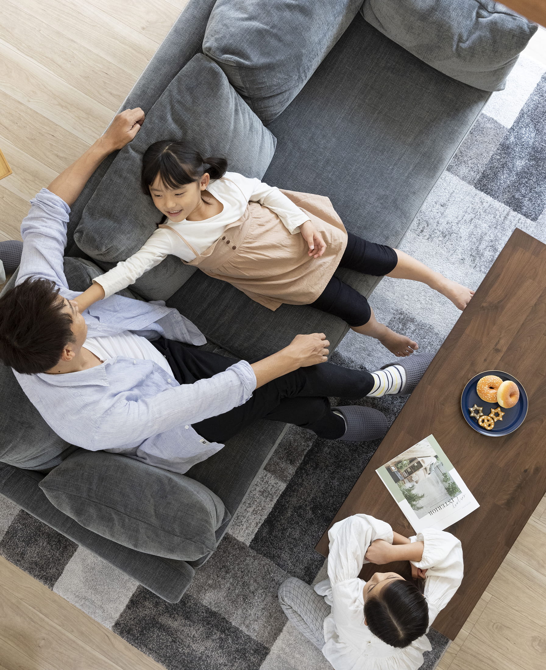 一般的な木造住宅では、耐震性の確保と間取りの希望の両立が難しい場合があります。耐震性の確保のために、柱や壁を作る必要があるためです。テクノストラクチャーの特長を生かすことで、余計な柱や壁のない大空間リビングなど、希望の間取りやデザインと耐震性を両立することが可能です。