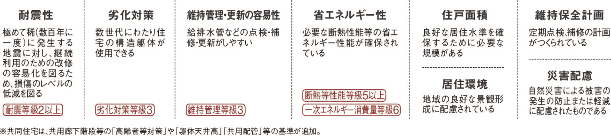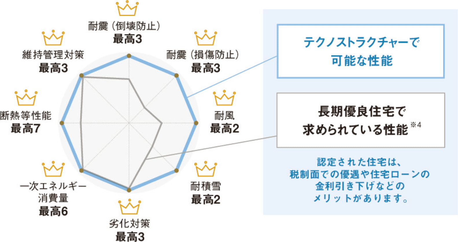 念願のマイホームを、長く大切に住まい続けていただくために、「長期優良住宅認定制度」の基準をクリアした住宅を標準性能でご提供しています。