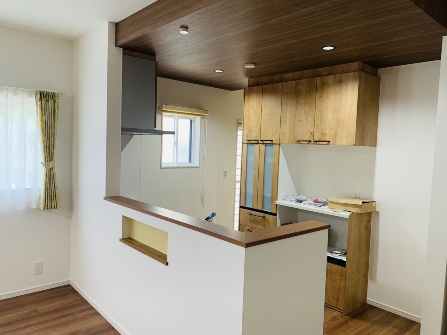 木目調を基調としたナチュラルテイストのキッチン。キッチン後ろにはランドリーを配置した家事楽動線