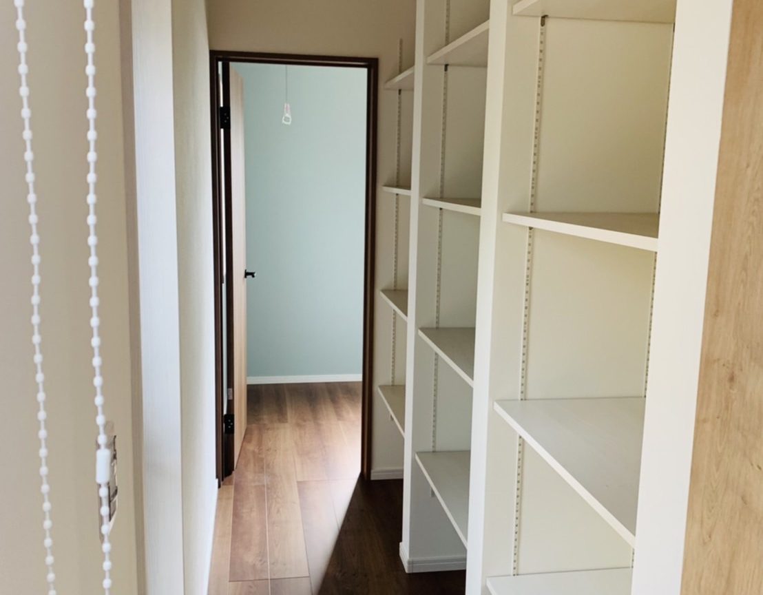 キッチン後ろにある大容量のパントリー。奥に見えるのがランドリースペースです。