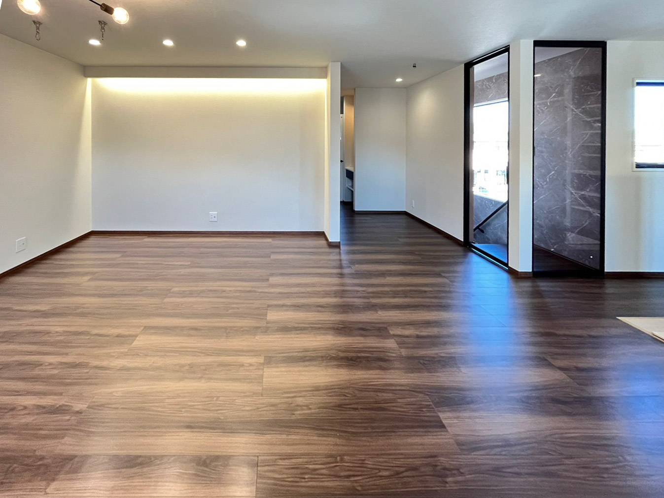LDKは広々大空間25.5帖。キッチンはあえての壁付けにしてその分ダイニングスペースを広くとりました。