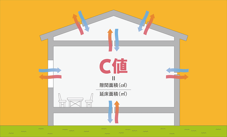C値とは室内の空気が流失したり、外気が入りこんだりする隙間の広さを計算した値です。数値の小さい方が外気の影響が少ないとされています。倉敷ハウジングでは断熱等級6に推奨されている、C値=0.7を標準数値としています。