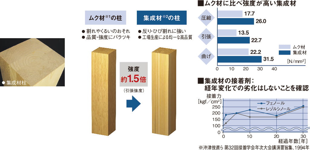 ムク材の約1.5倍の強度の集成材を使用しています。集成材は木の節や割れなどをできるだけ取り除き、特殊な接着剤で接着することで作られた建材で、反りやひびに強い性質を持ちます。工場で生産されているため均一な高品質建材を使用することが可能です。