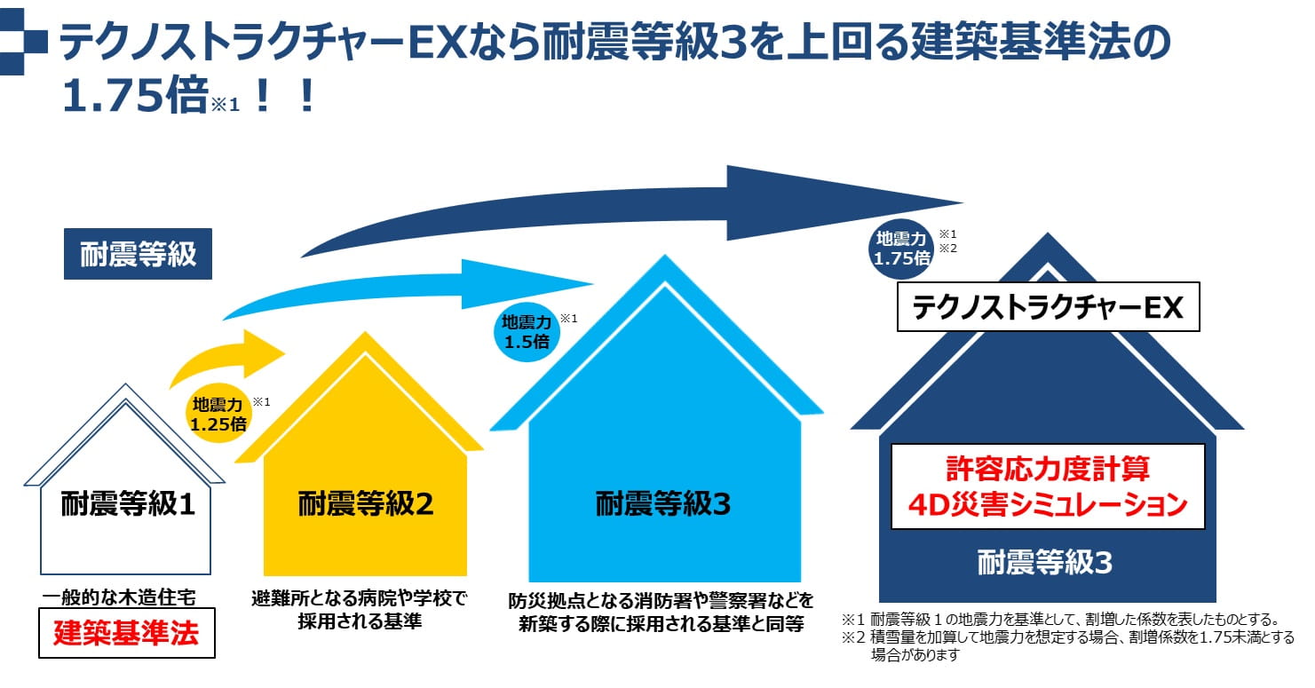 テクノストラクチャーEXでは、建築基準法の最適基準の1.75倍の地震力で強度確認をします。これは国の定める最高基準である耐震等級3も上回るレベル。繰り返す地震と闘うための、ワンランク上の構造計算です。