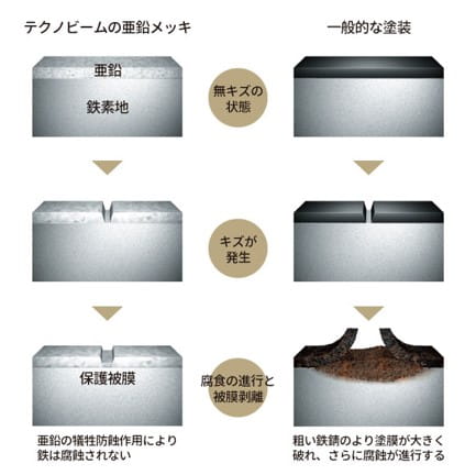 テクノビームには、鉄部分に防錆作用に優れた溶融亜鉛メッキ処理を施しています。亜鉛は鉄よりも先に反応する性質があるため、万一鉄が露出しても亜鉛が先に反応して緻密な保護被膜を作ります。これを犠牲防蝕作用と言い、亜鉛が鉄そのものを錆や腐蝕から守ってくれます。