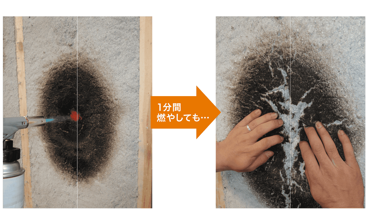セルロースファイバーはしっかりと難燃処理を施してあるので燃えにくく、炎をあてても表面が炭化していくだけ。万が一火災が発生しても、延焼を遅らせる効果もあって、さらには天然素材なので有毒なガスの発生もありません。難燃性能実験では、1000℃のガスバーナーで1分間燃やしても、表面は炭化しただけでした。