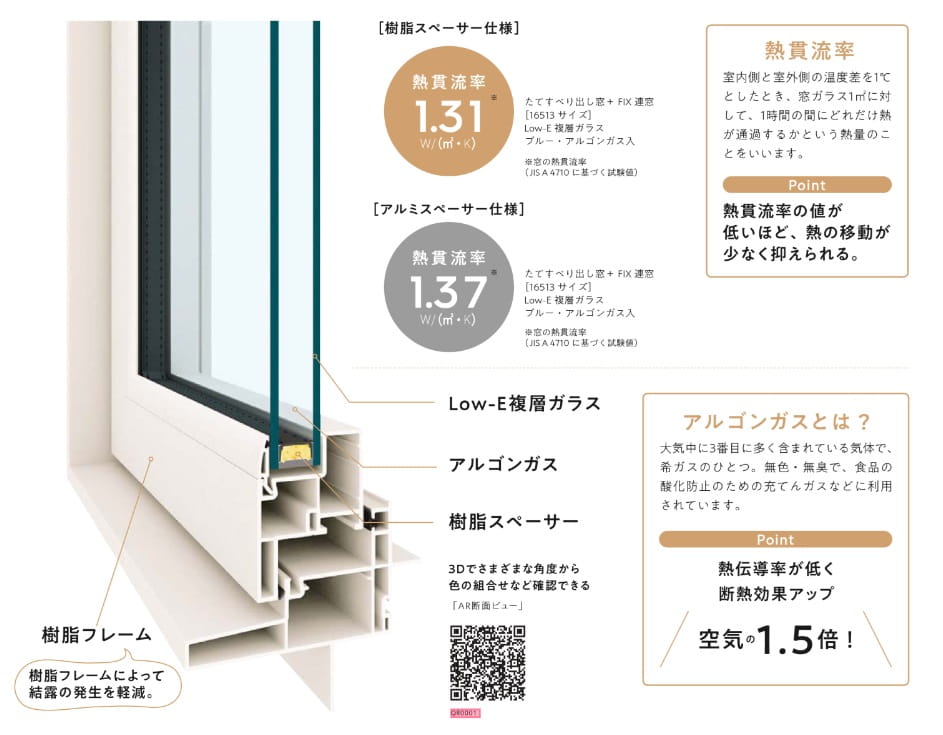 高性能樹脂窓APW330は、樹脂とLow-E複層ガラスで国内最高ランクの断熱性を実現した窓サッシ。熱伝導率がアルミに比べ約1400倍の1の樹脂が熱の出入りを抑え、ガラス間にはアルゴンガスを封入、さらにスペーサーも樹脂仕様になっており、住まいの快適を保ちます。