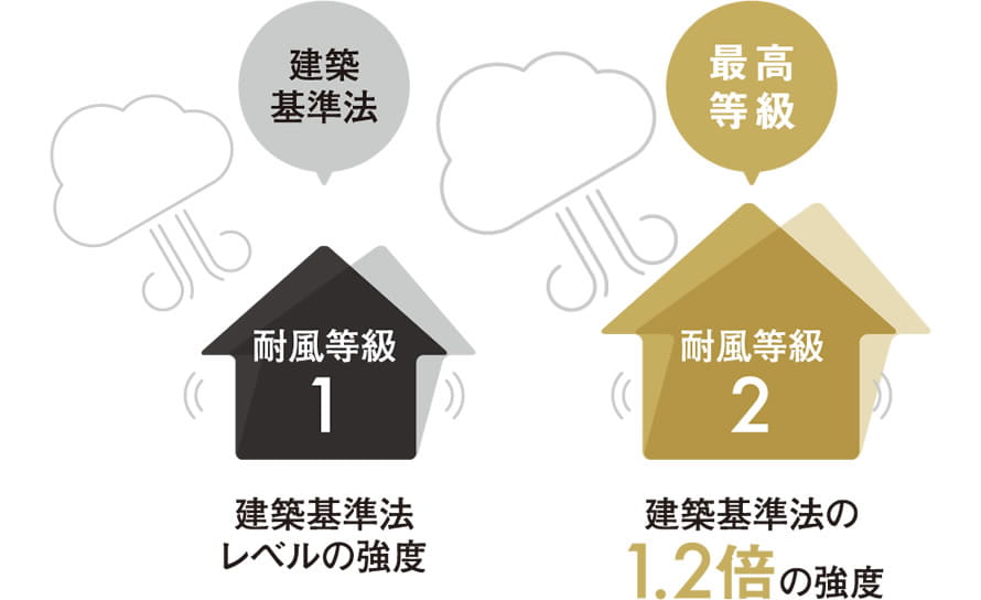 耐風等級2とは、「500年に1度程度の、極めて稀に発生する暴風の1.2倍の力でも倒壊しない程度」「50年に1度程度の、稀に発生する暴風の1.2倍の力でも損傷しない程度」と定義されており、耐風等級1の1.2倍の耐久性能になっています。また、「建物が強固になる」「建物の揺れを抑えてくれる」「内装仕上げ材をきれいに保てる」等の3つのメリットもあります。