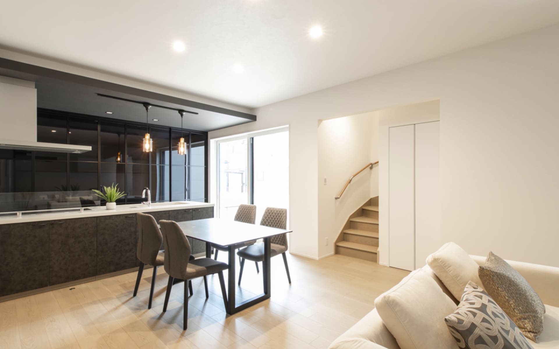 約20帖のLDKは笑顔が行き交う心地よい空間で、冷蔵庫まで隠せるカップボードがすっきりとした暮らしを叶えます。