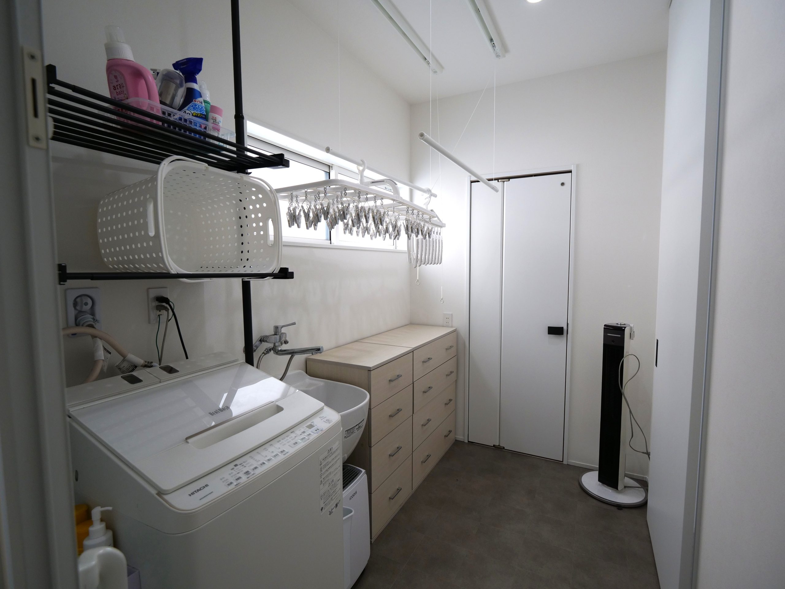 洗濯は、洗濯機からそのまま干せる動線になっていて、とても楽です。洗濯物も1階のエアコンでよく乾きますし、家事全体がスムーズに行えるよう設計されていて助かっています。収納スペースも豊富で、どんなものでもしっかり収まります。実家にも大きな納戸があったので広めの収納を希望して、思い通りの空間ができて満足しています。