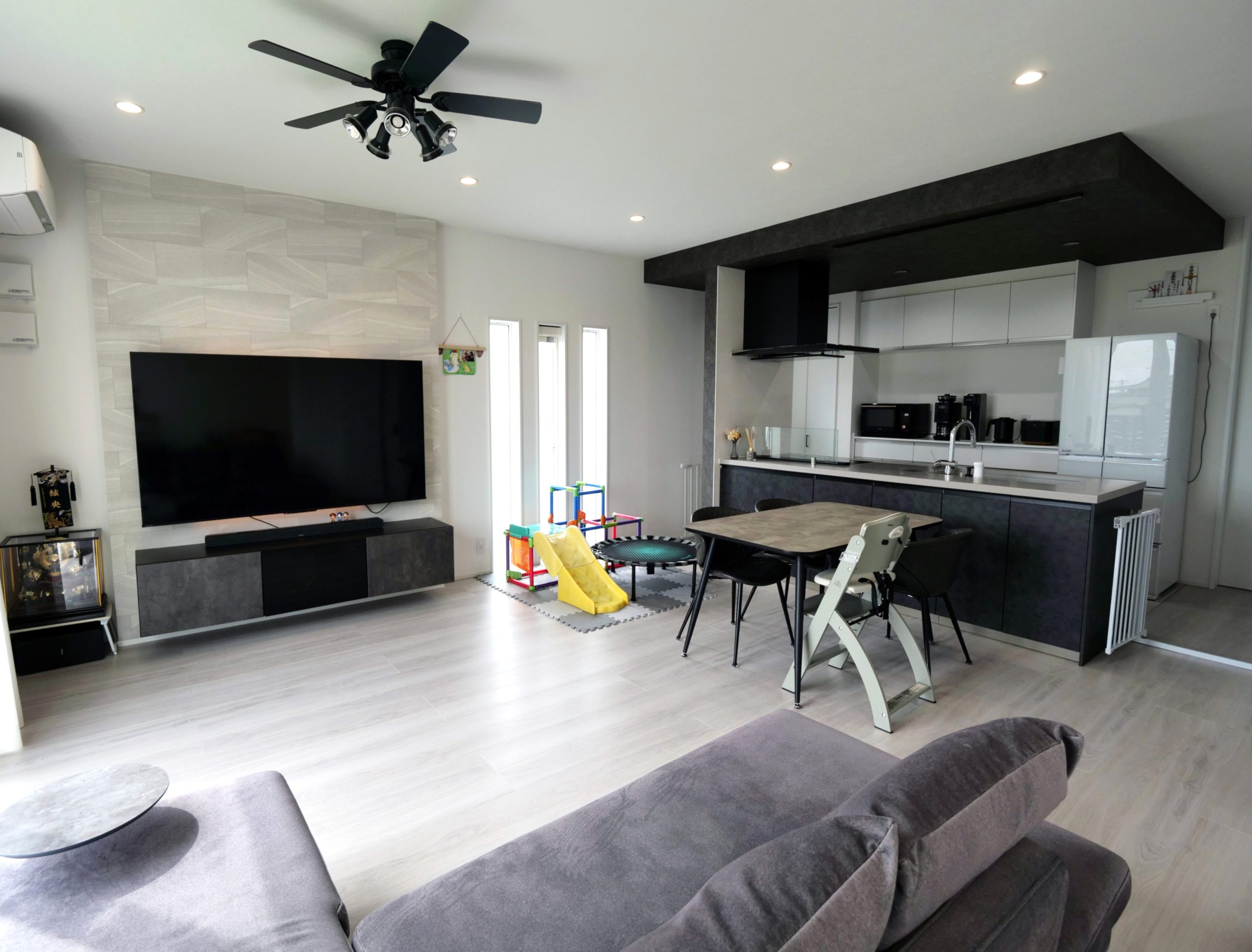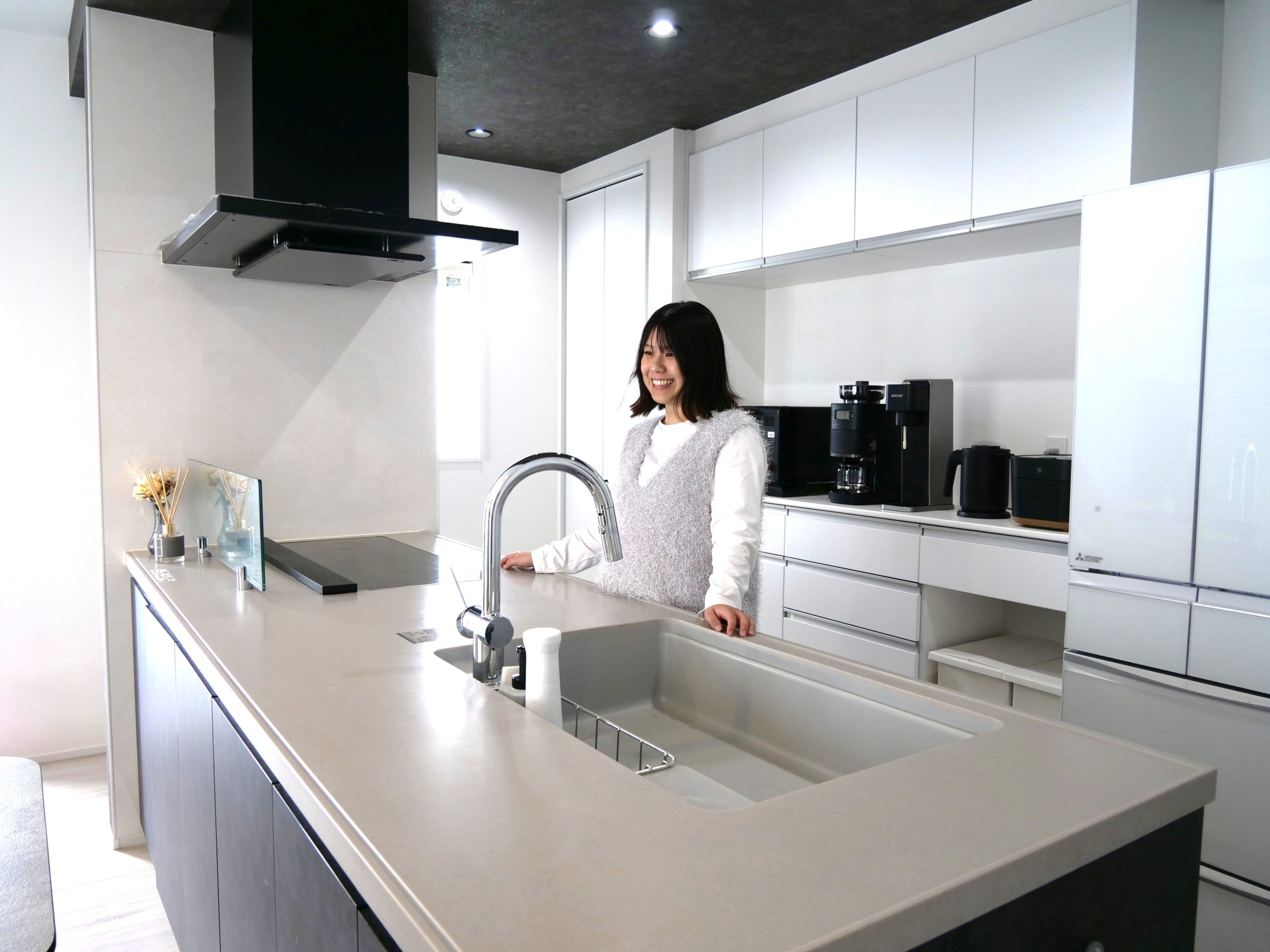 もともと白いフローリングにしたいと考えていたのですが、コーディネートの方は私たちの雰囲気や希望をしっかりとくみ取ってくださり、イメージにぴったりのカラーを提案していただきました。1階全体を統一感のあるカラーでまとめていただき、白を基調とした空間に黒の家電が映える、理想通りのコーディネートになりました。カップボードも壁と一体化するよう白で揃え、空間を広く見せる工夫ができたのも大満足です。