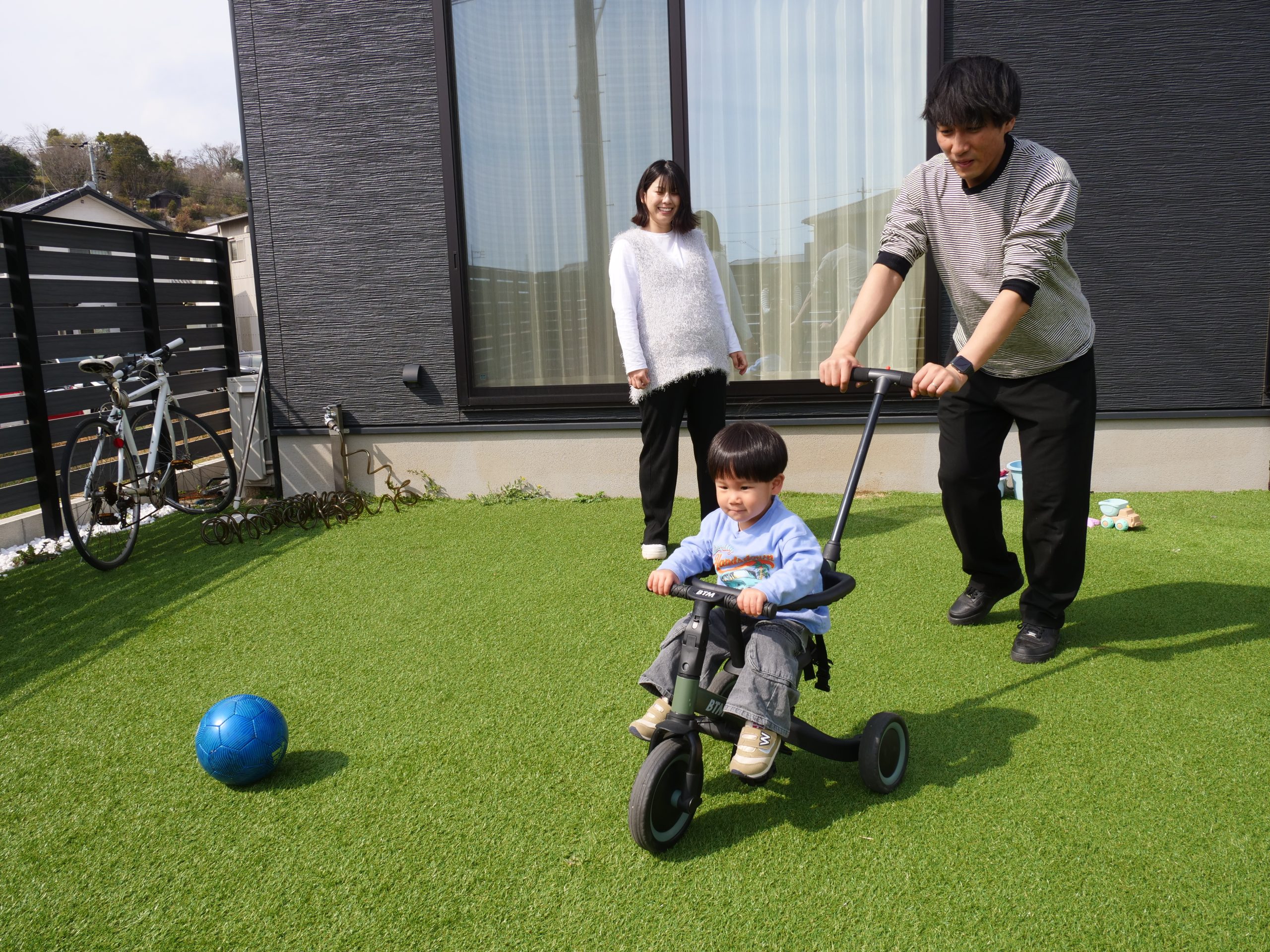 広い庭があるおかげで、子どもと思いっきり遊べるのが本当に楽しいです。休みの日は一緒にボール遊びをしたり、自転車の練習をしたり、季節によっては水遊びをしたりと、外で過ごす時間が増えました。 アパートではなかなかできなかった遊びも、庭があることで思いきり楽しめるようになって、子どもの笑顔を見るたびに「この家にして良かったな」と実感しています。