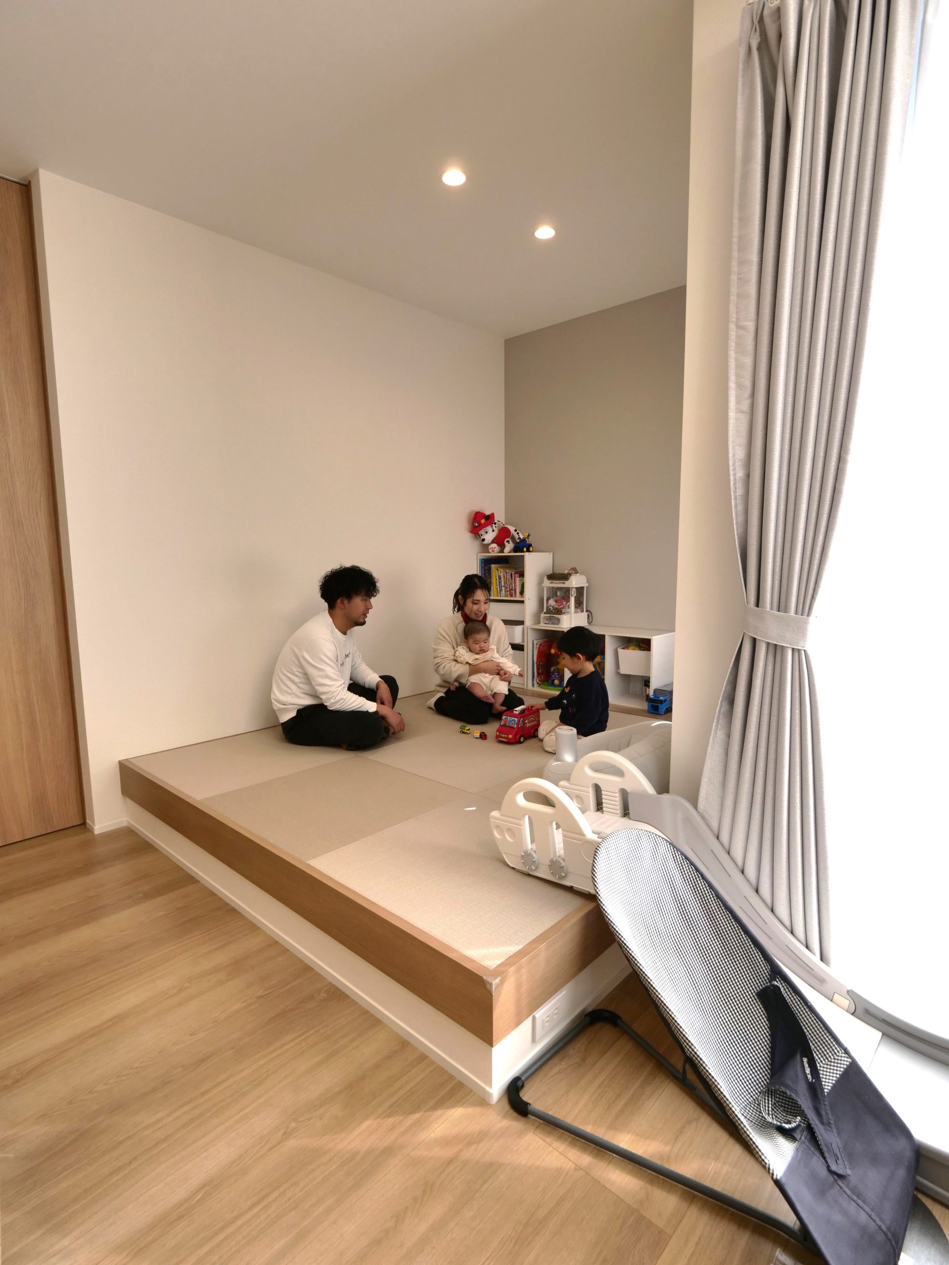 畳スペースは、子どもがまだ小さいこともあり、最初から取り入れたいと考えていました。フラットにするか小上がりにするか迷いましたが、小上がりにして正解でした。キッチンから子どもが遊んでいる様子が見えるのも安心できますし、吹き抜けは建築士さんの提案でしたが、採光がよくて本当に気に入っています。