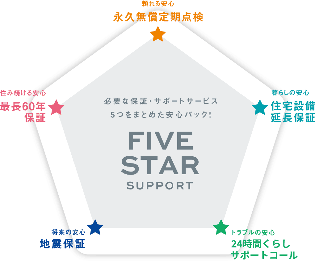 家の構造と防水などに関する長期保証。法律で定められた以上の初期保証期間を設け、最大60年まで延長できます。長く安心して暮らしていただくための保証です。