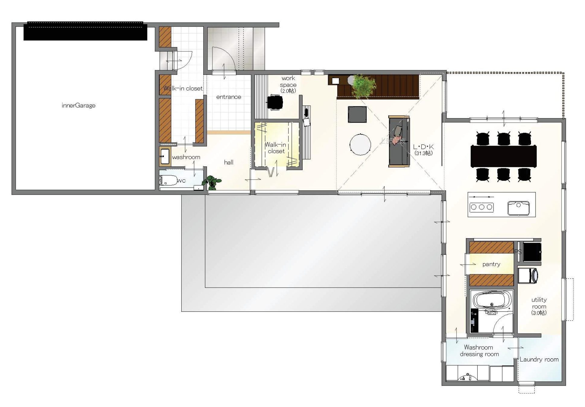 友人がたくさん来ても使いやすいアイランドキッチンは、中庭の隣に配置。リビングからもつながる中庭はセカンドリビングとして大活躍!