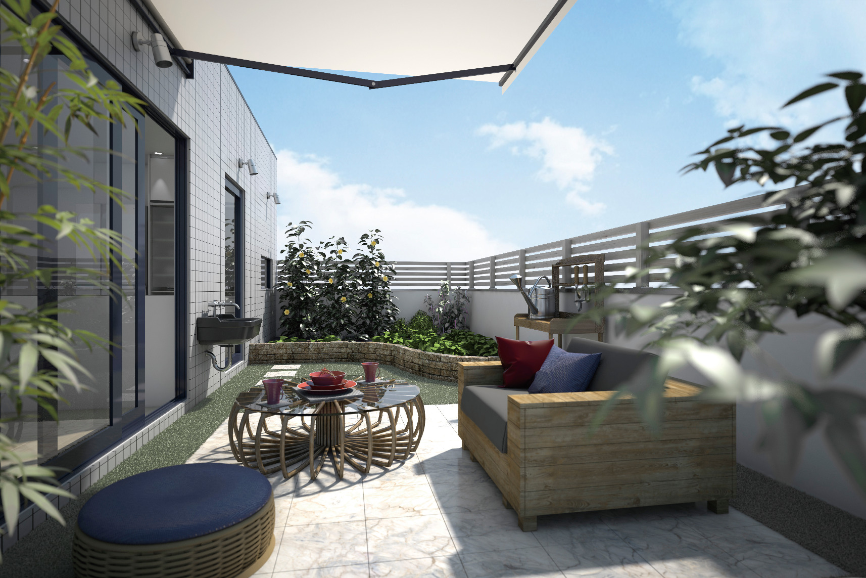広いバルコニーでは、家庭菜園を楽しむこともできます。採った野菜はすぐ横のキッチンへ。庭が確保しづらい都市部にあっても屋外での楽しみが広がります。