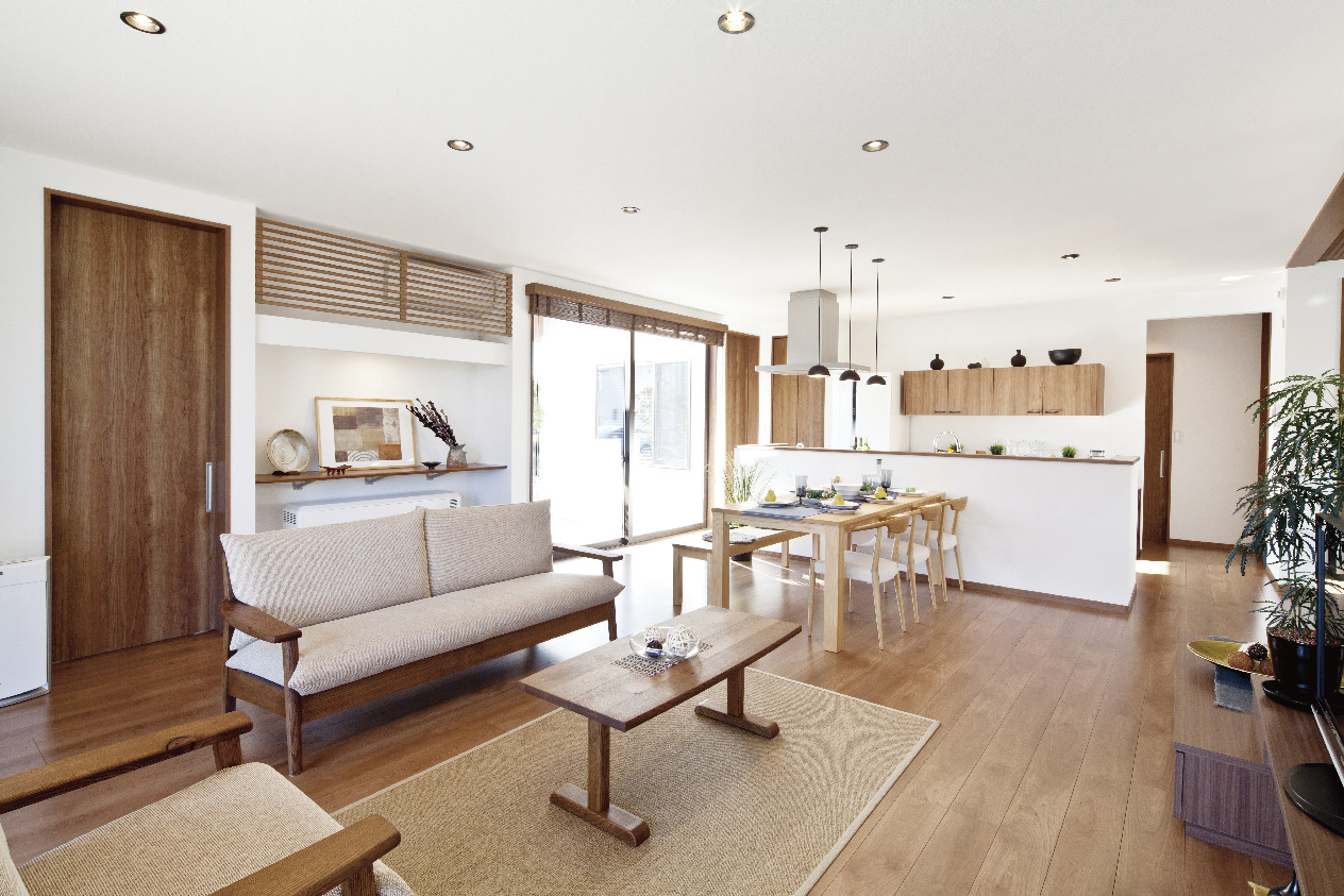 デッキとつながる5mの広々リビング。南面の大きな開口からはたっぷりと光が入り、家族が自然と集まります。
