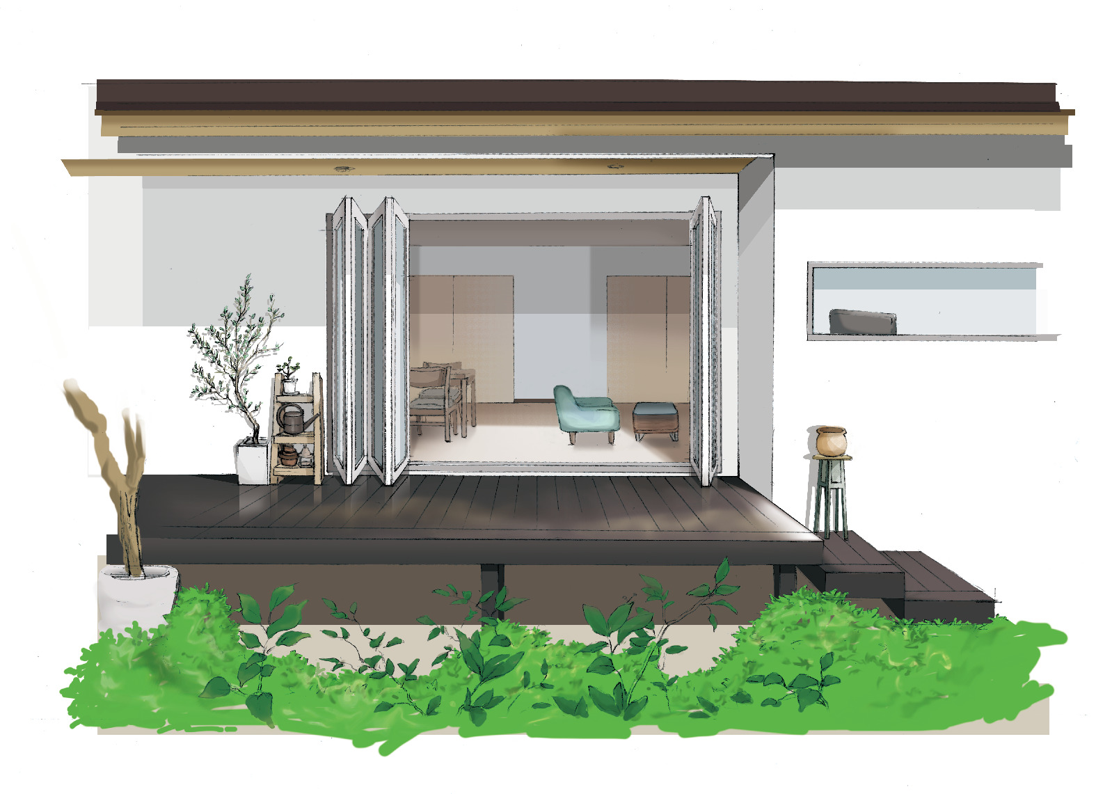 季節感あふれる庭を常に感じられる平屋。その庭と大開口でつながるウッドデッキは、太陽の下に広がるセカンドリビング。内と外がゆるやかに交差することで、お子さまが自然とふれあい、のびのびと成長できます。