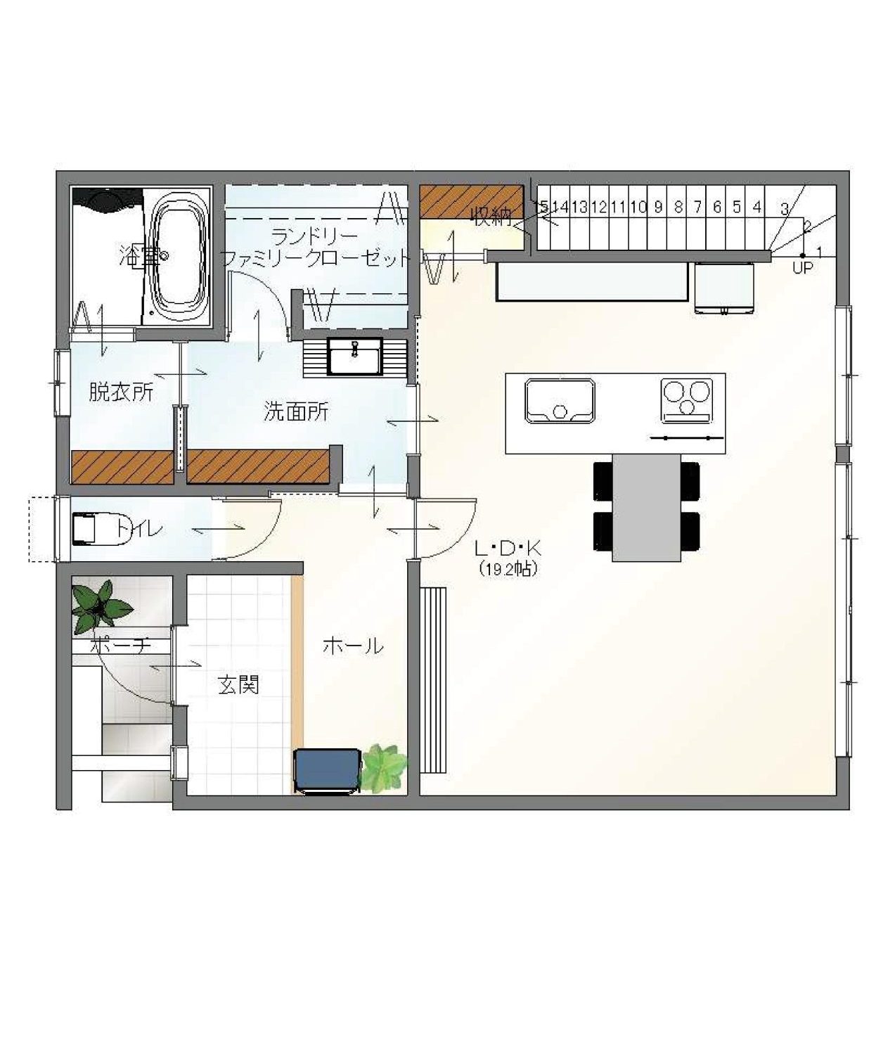 余計な要素をそぎ落としたミニマルな外観デザインはプライバシー性が高く自分たちの暮らしを大切にできる住まいです。間取りは、贅沢に20帖弱のLDKにオープン階段を設け開放感をプラスしました。