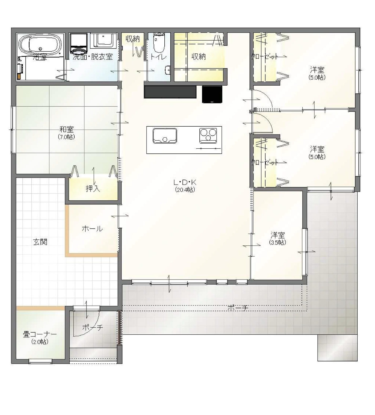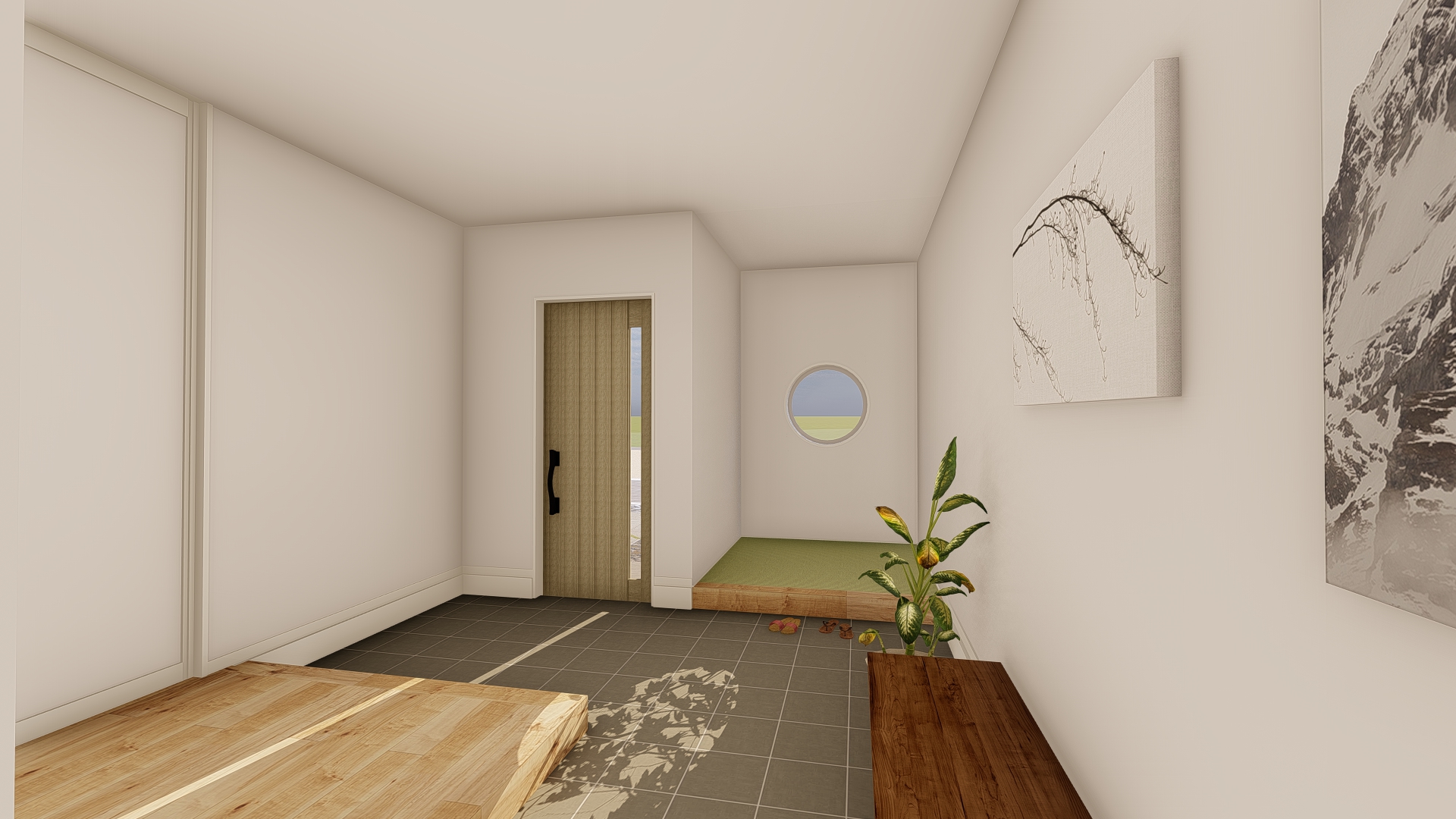 広々とした玄関の土間空間は、ちょっとした畳スペースを配置し、腰掛けてご近所さんとおしゃべりを愉しむことができます。