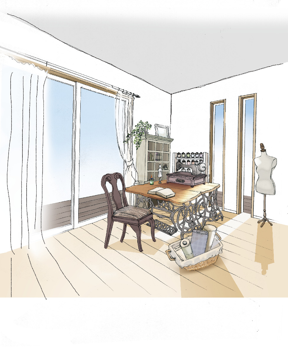 自分の時間も確保できるようになったふたりのために、それぞれの趣味のスペースを設けました。奥様はリビング横で大好きな裁縫、ご主人は土間空間で釣り竿のお手入れなどを愉しみながら過ごせます。
